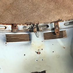 The spring mount has been poorly welded & bolted, however intact . The base also has also been bondo repaired w/ surface rust, the inner original paint so no accident damage