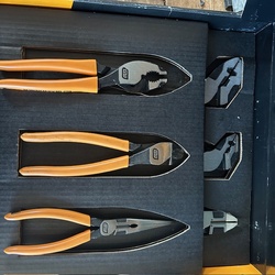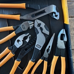10" & 12" straight jaw tongue & groove pliers; 8" diagonal cut pliers, 8" long nose pliers, 8" slip nose pliers, and a 9-1/2" linesman pliers
